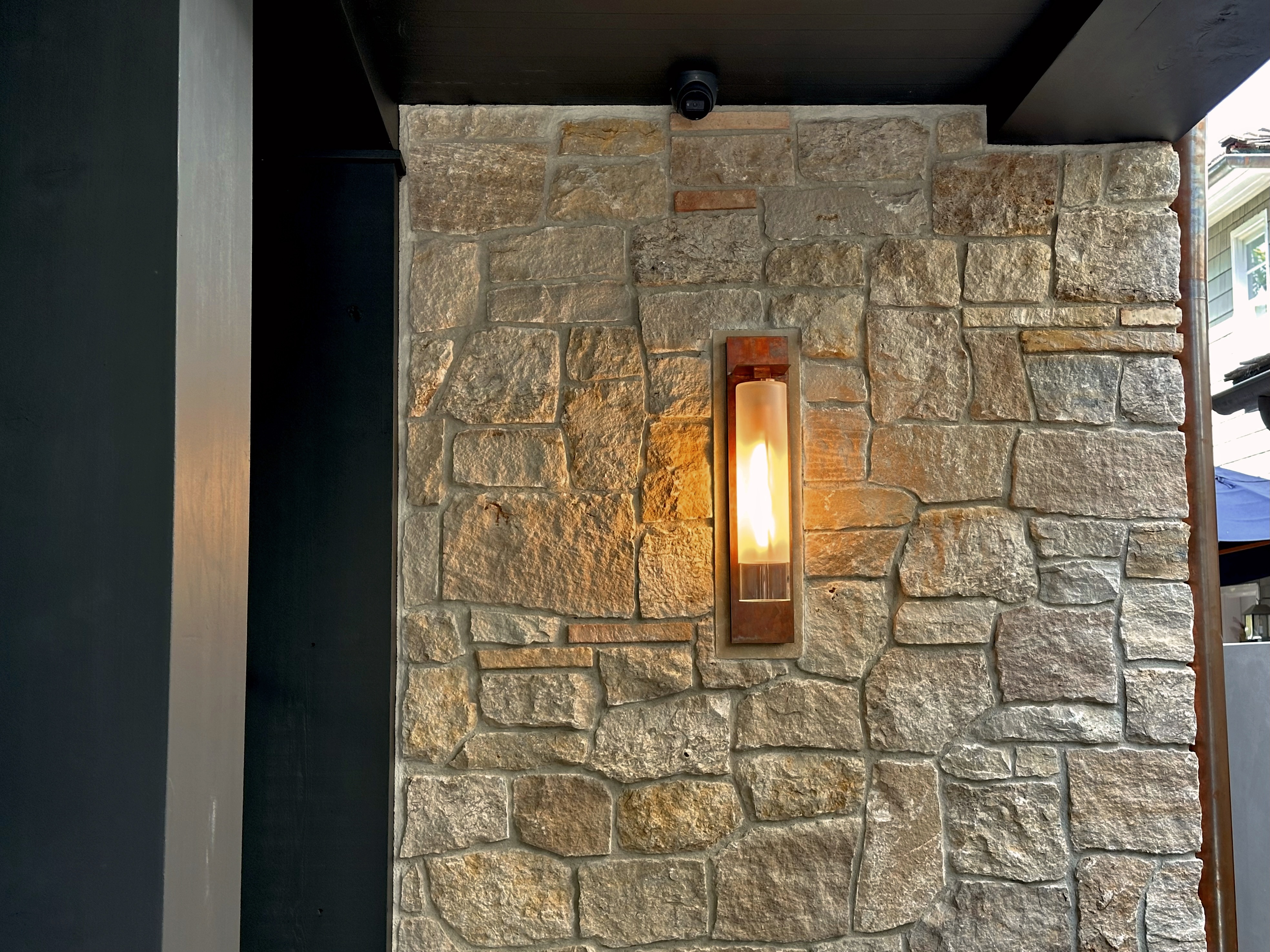 Upstairs in the covered deck area, we installed a Samsung Terrace Partial Sun Outdoor TV, wall-mounted above the stone fireplace for the perfect viewing angle. Designed for outdoor use, it delivers bright, vibrant picture quality in any light.