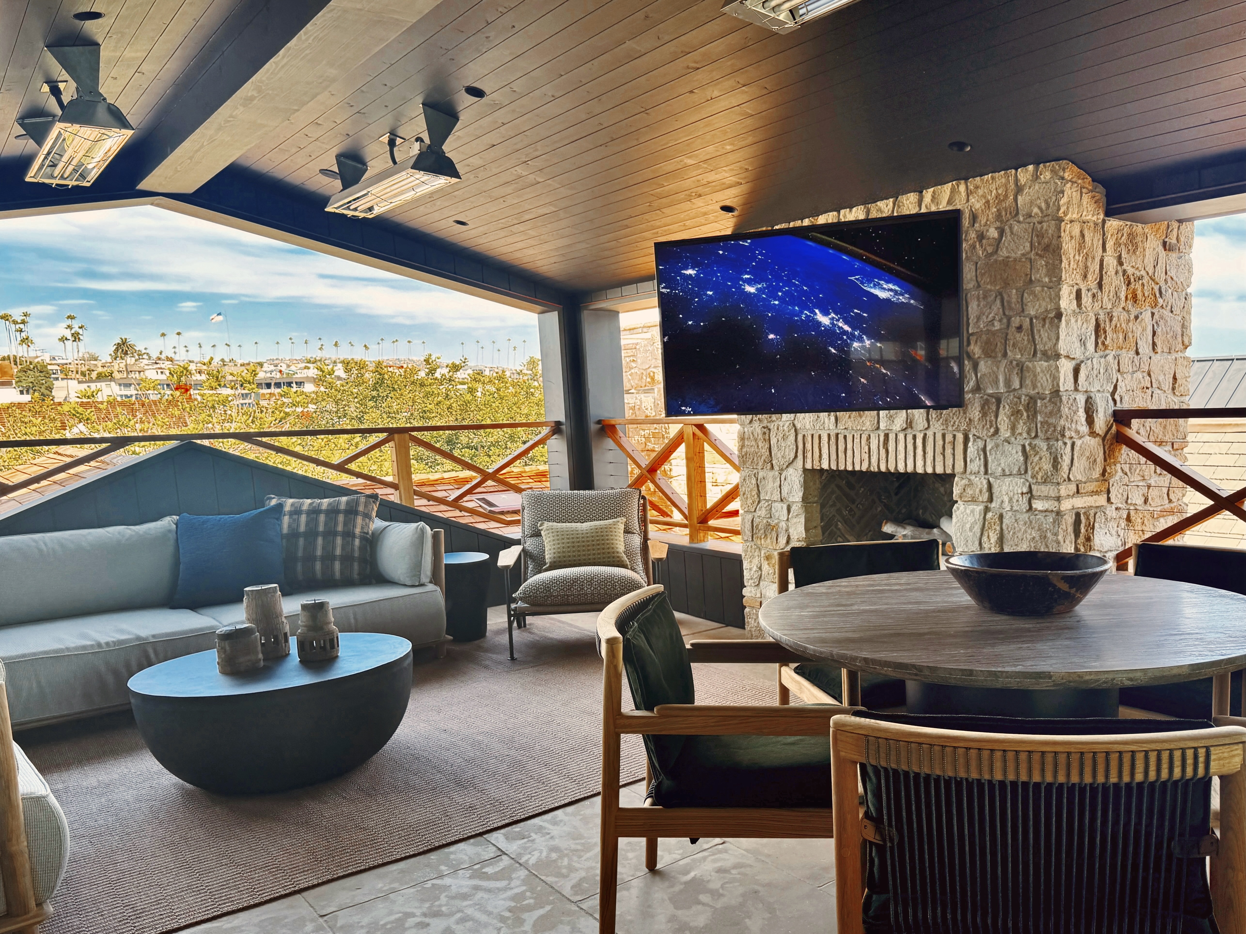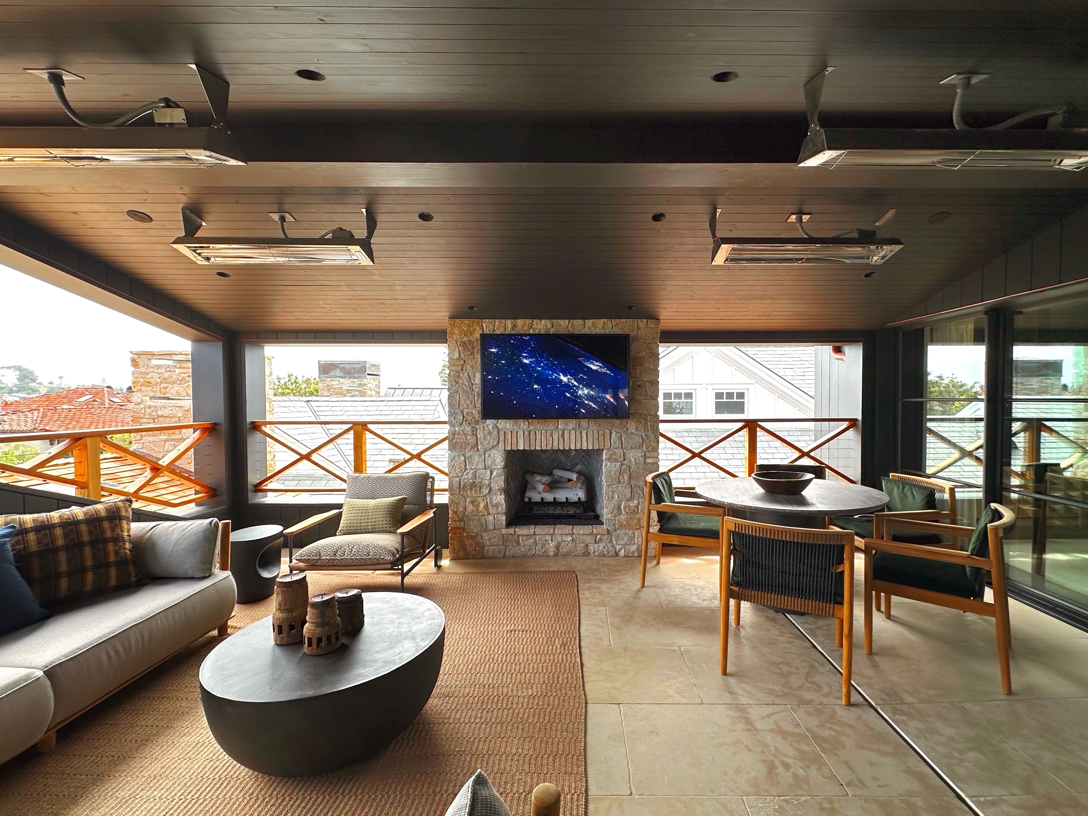 Upstairs in the covered deck area, we installed Samsung Frame TVs along with Origin Acoustics in-ceiling speakers, color-matched to the ceiling for a clean, polished look. The result is a cozy setup that’s perfect for movie nights or relaxing evenings outdoors..