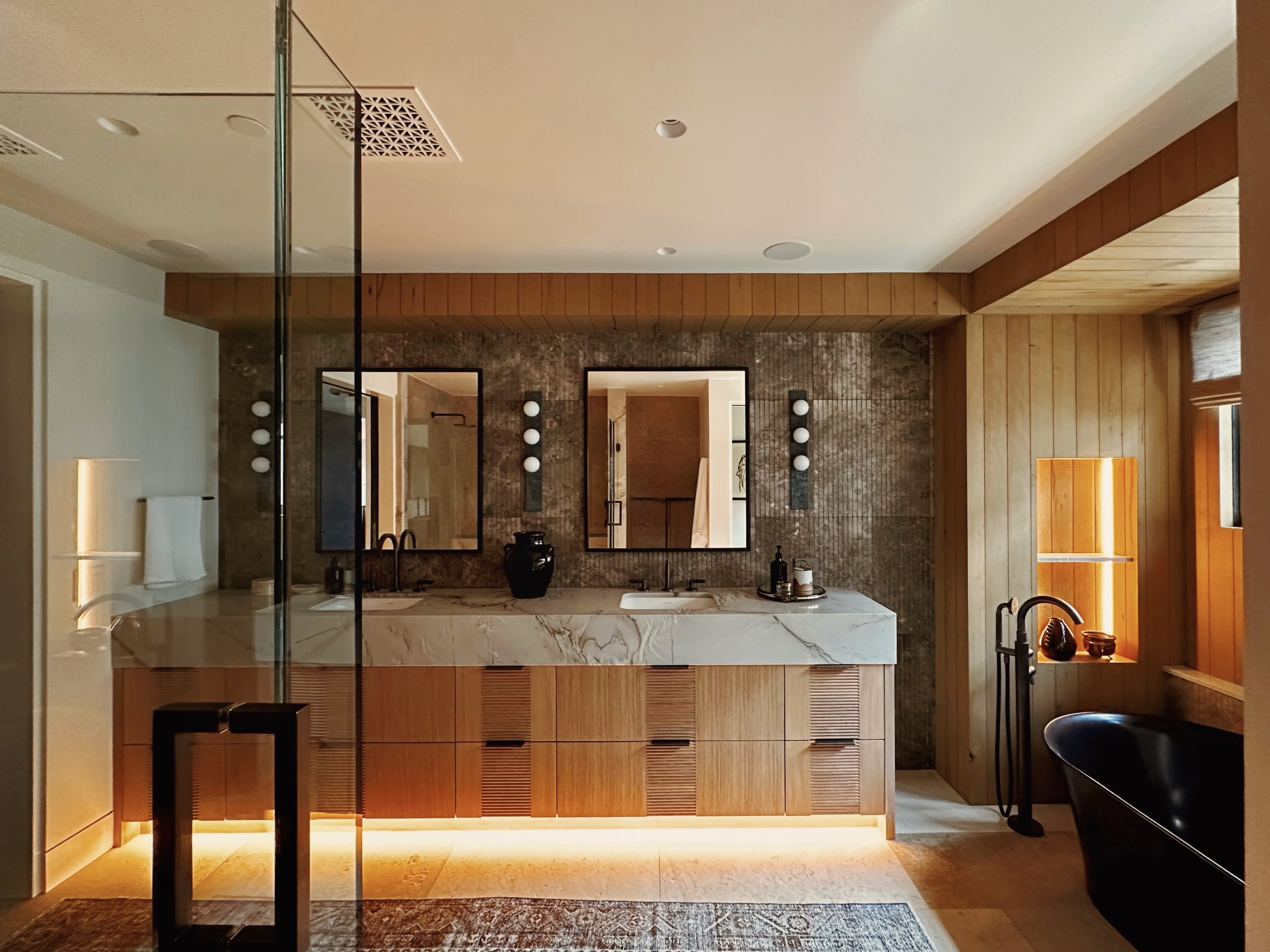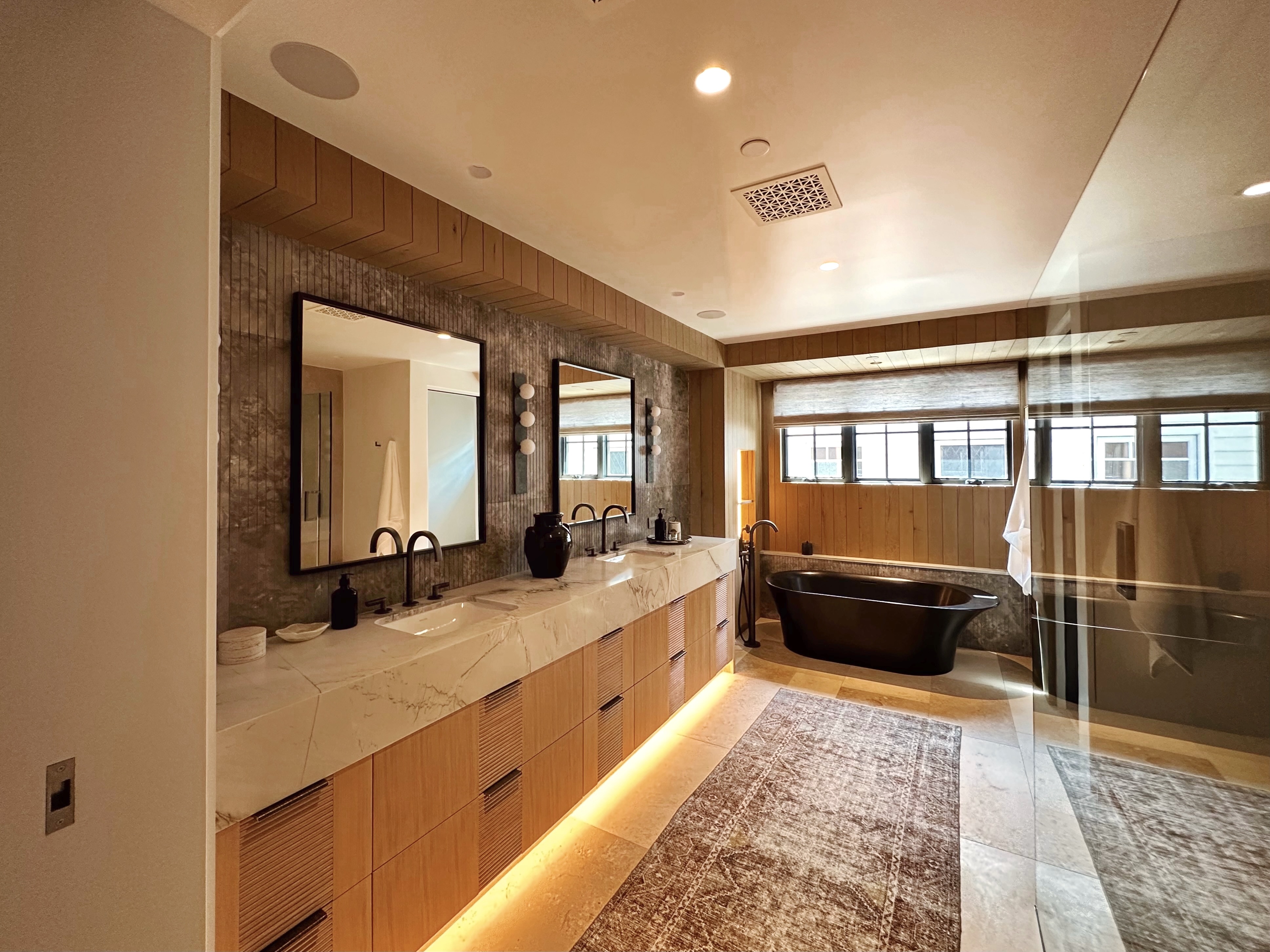 We added Origin Acoustics in-ceiling speakers throughout the master bathroom, and while the lighting was provided by others, we integrated it into the Control4 system for easy control.