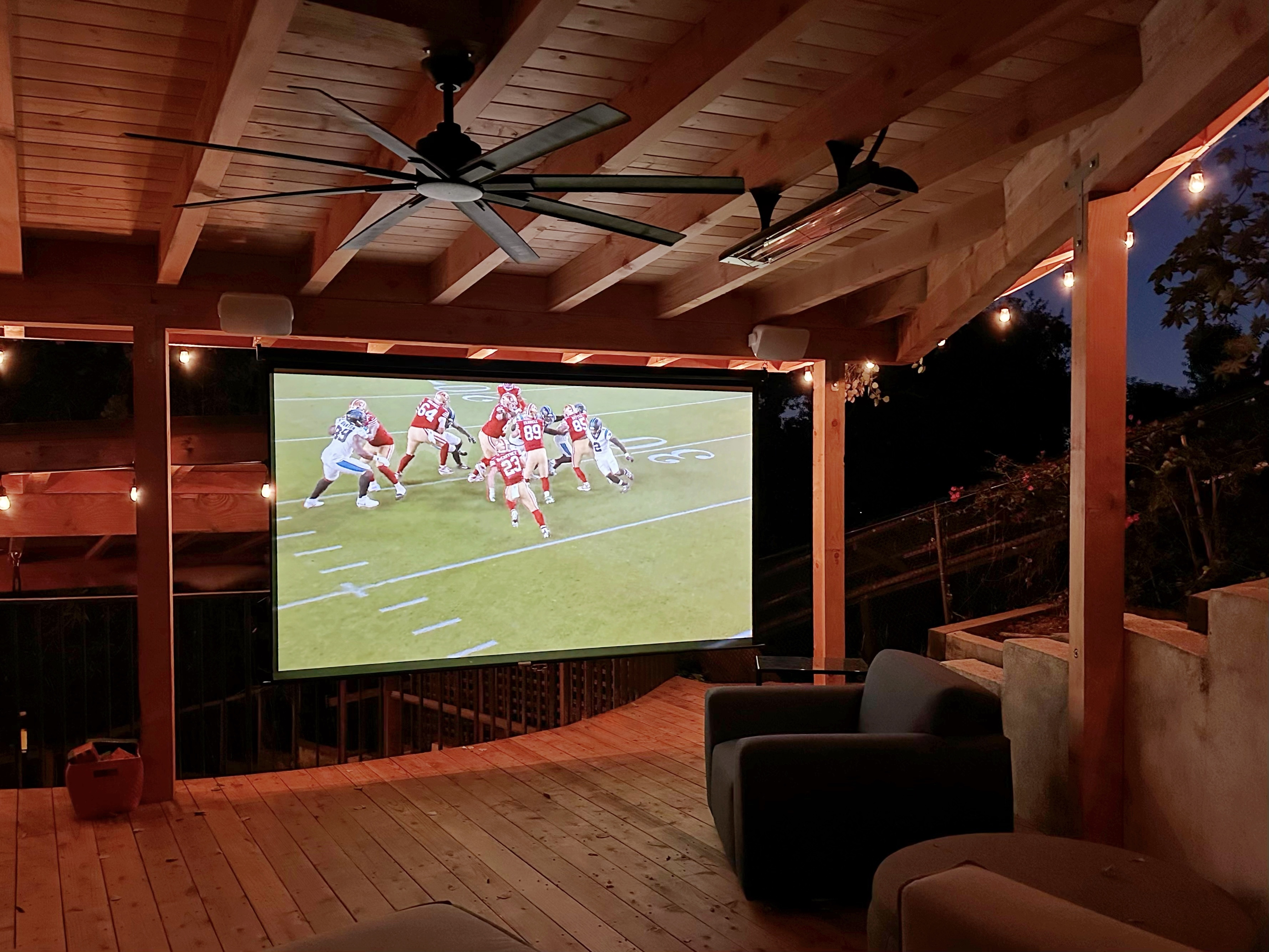 To bring his vision to life, we installed a complete outdoor entertainment system designed for performance and reliability. The setup features an Elite Screens outdoor projection screen paired with a BenQ projector, protected inside a DeerTV Medium Outdoor Weatherproof Projector Enclosure for long-term durability.